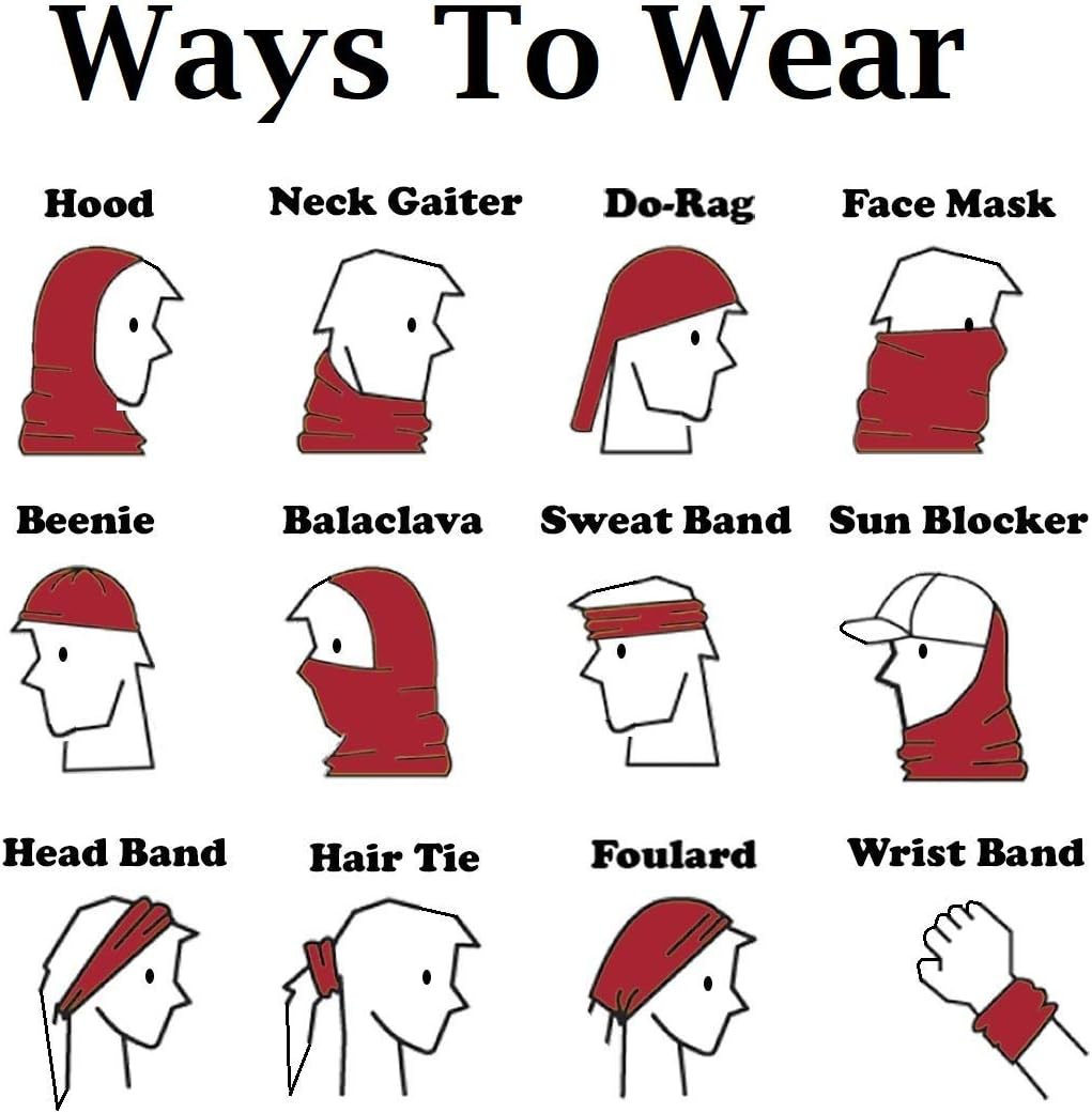 - VERSITILE:Tubular bandannas can be used as headband, wristband, mask, scarf, hairband, do-rag, bandana, skull cap, balaclava, neck gaiter, scrunchy, hair tamer, and more!