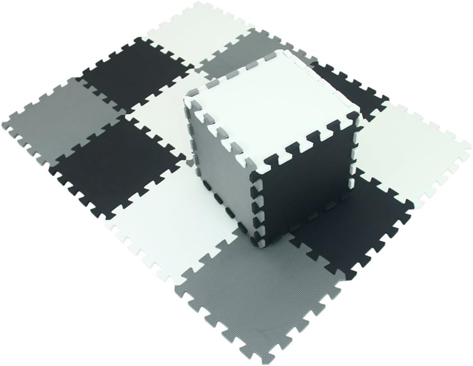 - Cover area: 86CM x 170CM( Β±1CM) / approx. 1.46 SQ. M,one sets 18pcs,(300mm x 300mm x 10mm). Package includes 6 WHITE ,6 BLACK and 6 GRAY interlocking foam tiles, making it a perfect workout and training accessory.