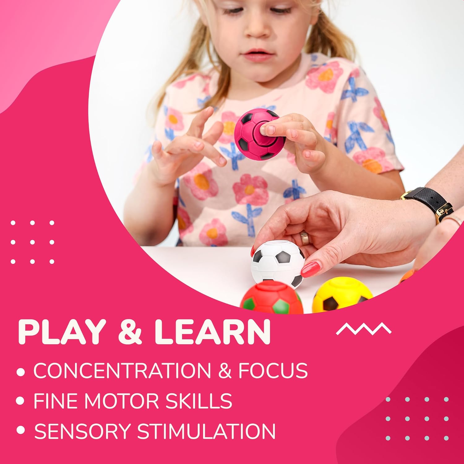 • Spinner toy have a pink color. Spinner toys for kids resemble a soccer ball
