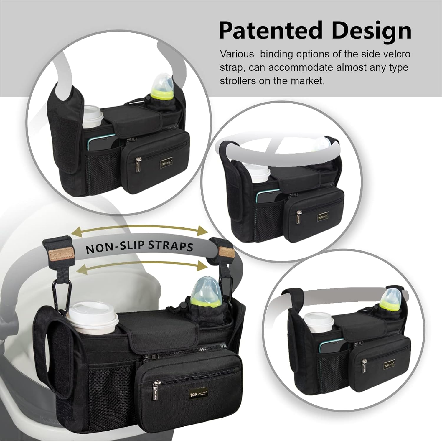 - UNIVERSAL FIT: The genius ear-shaped straps on both sides can fit various stroller handlebars regardless of the shape or angle. The complimentary Velcro hooks (worth $11.99) made of non-slip leather provide another option. It fits most strollers like Uppababy, wonderfold wagon, bob, mockingbird, Nuna, doona, radio flyer wagon, graco, city select, skip hop, britax, evenflo, umbrella strollers, joggers, single and double strollers. It can also be used for back of the car seats, cribs, walkers.
