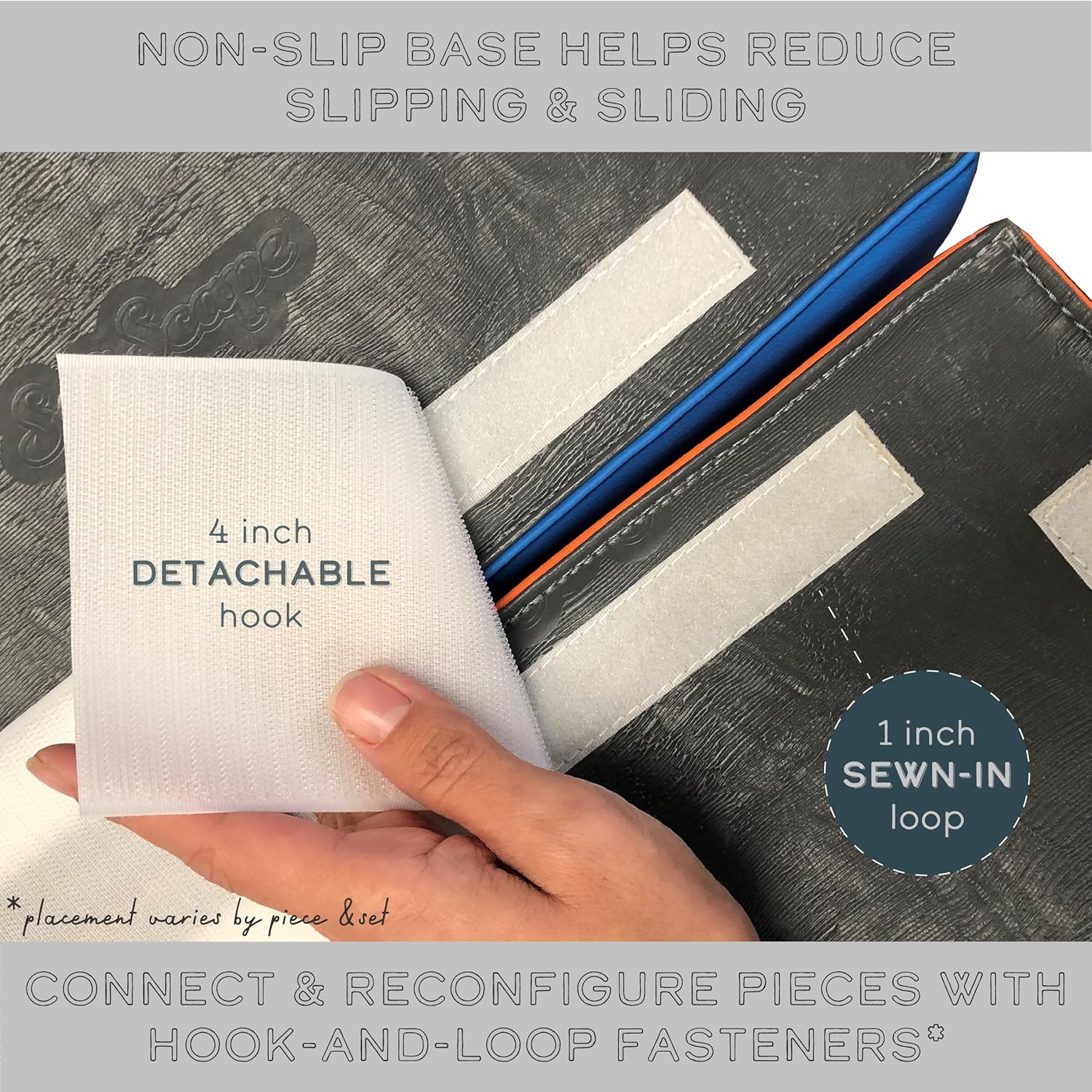 • NON-SLIP BASE: textured non-slip bottom reduces slipping and sliding while at play; comes with hook-and-loop fasteners which can be rearranged to build different configurations and keep pieces in place