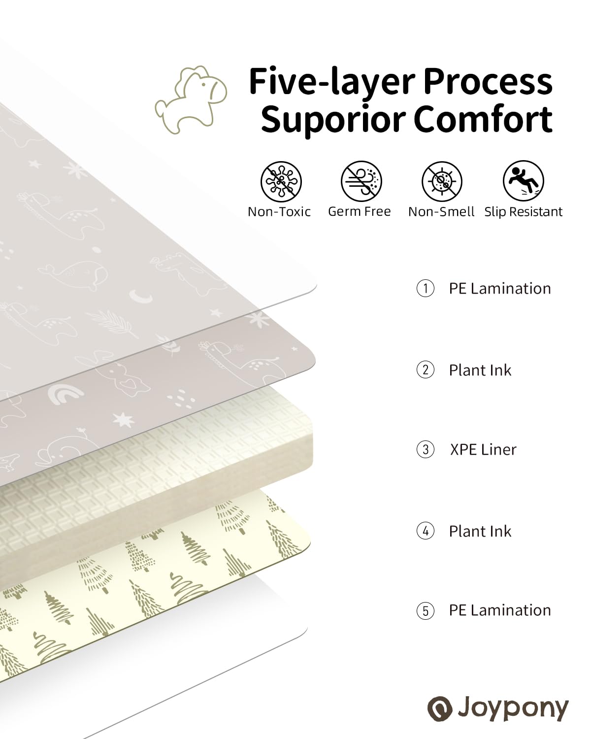 - [SAFETY & COMFORT - FOREMOST PROMISE] - Made from high-density XPE foam material, our baby play mat is BPA-free, child-friendly, and no chemical smell, ensuring a soft and safe play surface for infants and toddlers. Its cushioned design is perfect for protecting little ones from hard floors and providing extra support during tummy time. Joypony play mat is truly reliable, safe and and is ready to use right out of the box.