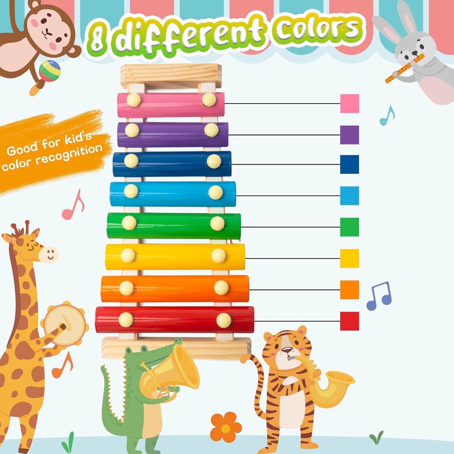 - Accurate Tuning - Crafted with 8 accurately tuned, brightly colored keys, this xylophone hones rhythm and music skills. this mini xylophone visually aids learning through colors and offers diverse sounds.