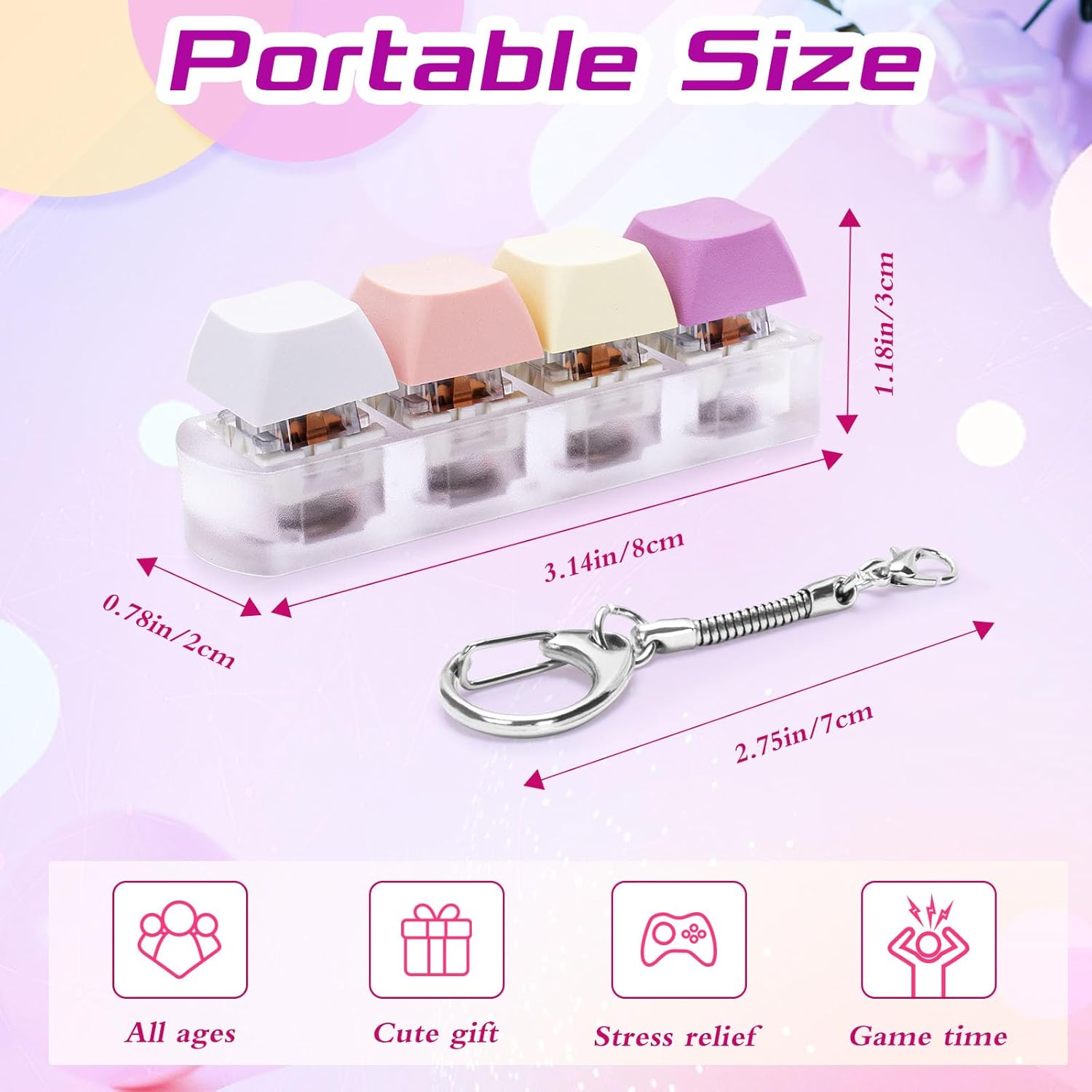 • Keyboard Fidget Toys: The fidget keyboard toy consists of four keycaps, four internal cores with LED light and a transparent frosted base, and is a 4-in-1 keyboard fidget with a keychain. The color of the 4-in-1 mechanical keycap fidget is Macaron in white, pink, yellow and purple and it is a cute and creative fidget toy. Click on the button of your small fidget toy and it will sparkle with colorful LED lights