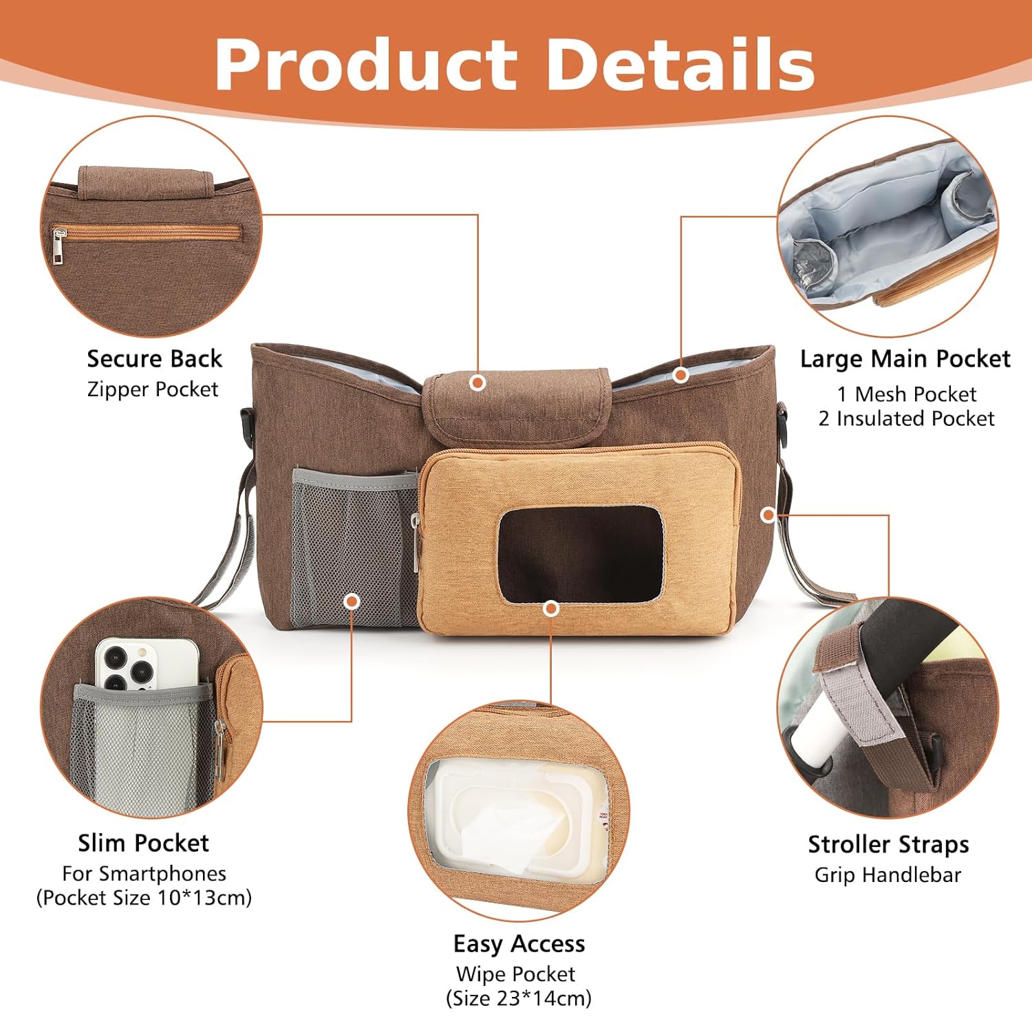 - Multi Structure: This stroller storage organizer equipped with multifunctional structure: Insulated cup holders on both sides to place baby bottles and drink cups; The middle large compartment can accommodate baby diapers, wipes, pacifiers, teething toys and other accessories; Equipped with a convenient wipe pocket for easy access of wet wipes; Mesh phone pocket keep your phone within reach; Secure back pocket for wallet or other important items.