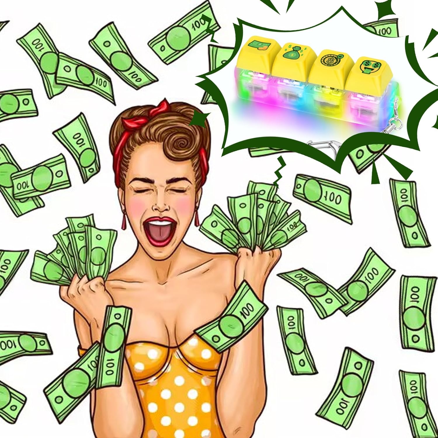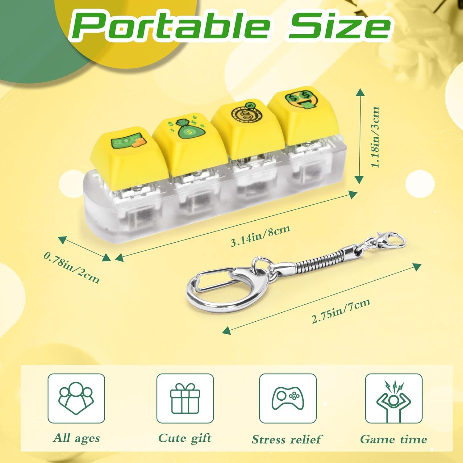 • 【Dollar Keyboard Fidget】The fidget keyboard toy consists of four keycaps, four internal cores with LED light and a transparent frosted base, and is a 4-in-1 keyboard fidget with a keychain. The color of the 4-in-1 mechanical keycap fidget is is styled with a dollar design and it is a creative fidget. Click on the dollar button of your small fidget and it will sparkle with colorful LED lights. Clicking on dollar keyboard makes you wealthier.