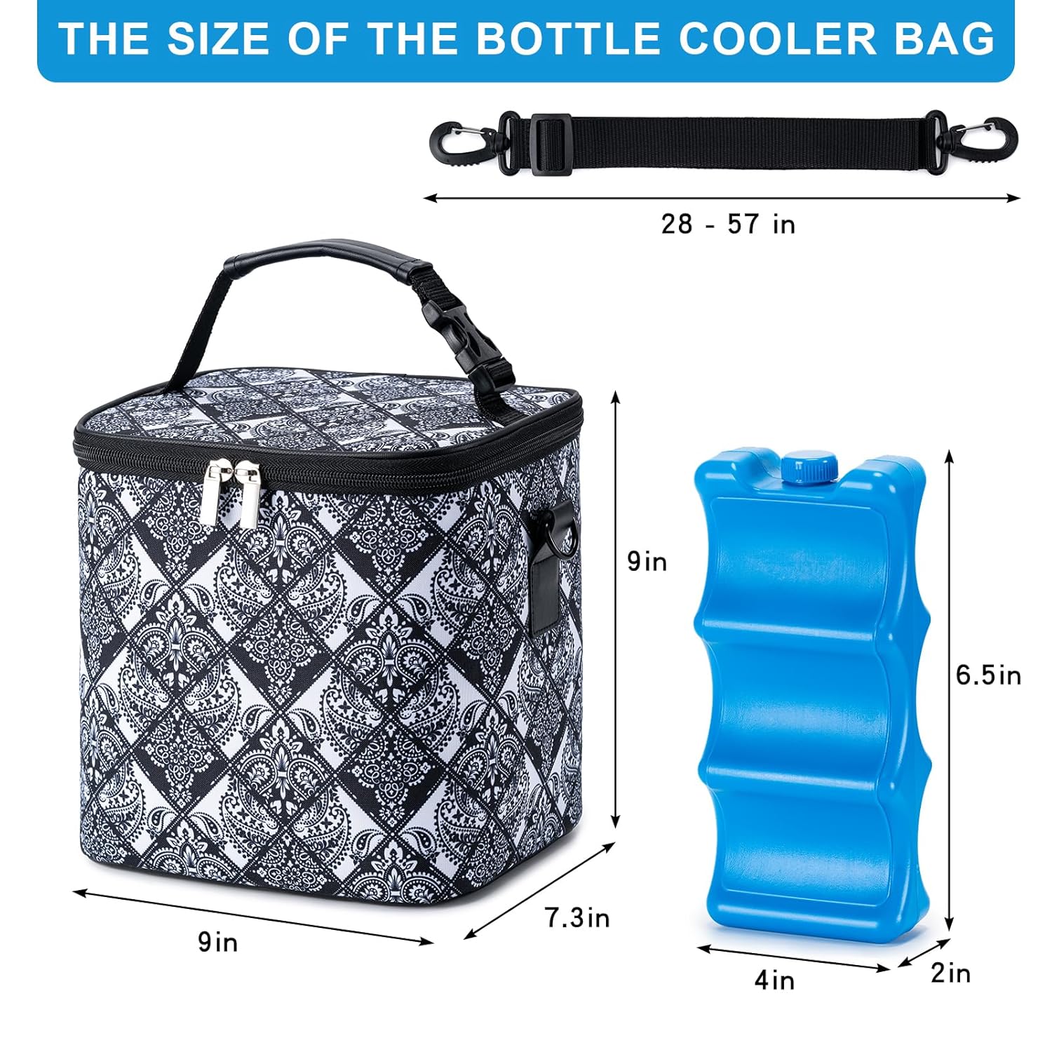 - Large Capacity:Breastmilk Cooler Bag comes with an ice pack that can place up to 6 up to 9 ounce baby bottles. Size of baby bottle bag L9" X W7.3"X H9"