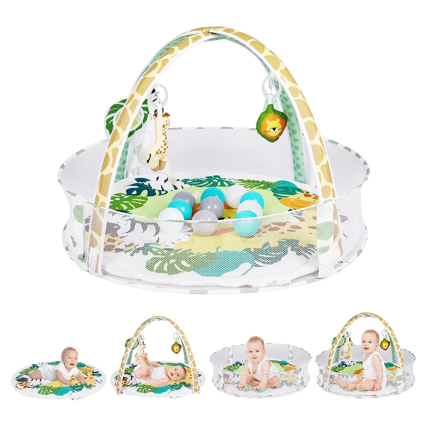 - [Multi-Mode Baby Play Mat Activity Gym]: Featuring fun patterns and colors, our baby activity mat is designed to attract and entertain. Supports tummy time, seated play, and ball games, aiding exploration and sensory growth. (Includes ocean balls, fabric toys, and mirror)