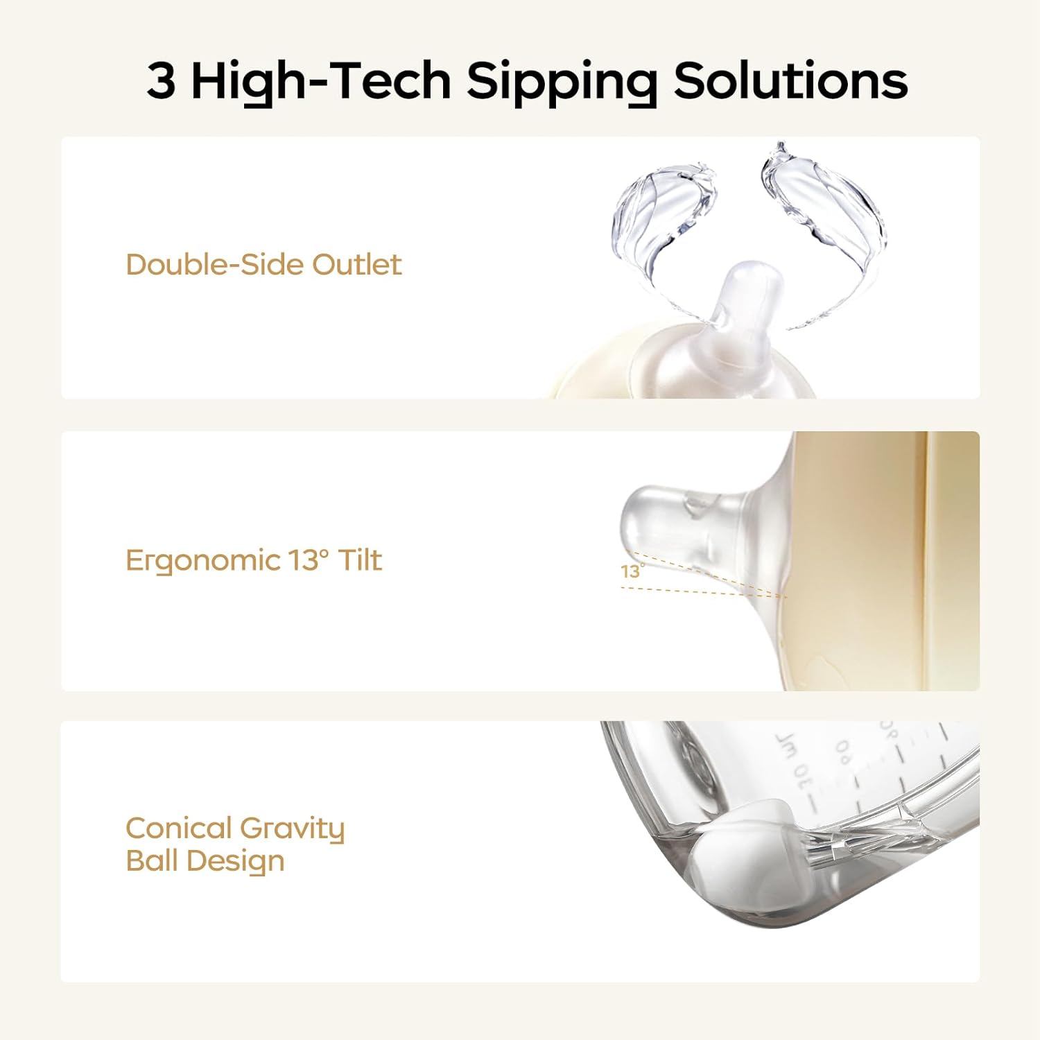 • 【Conical Gravity Ball】Baby milk cup with new conical gravity ball, easier to suck even low water level. sippy cups adopts double sealed valve, no matter how the baby moves will not leak milk
