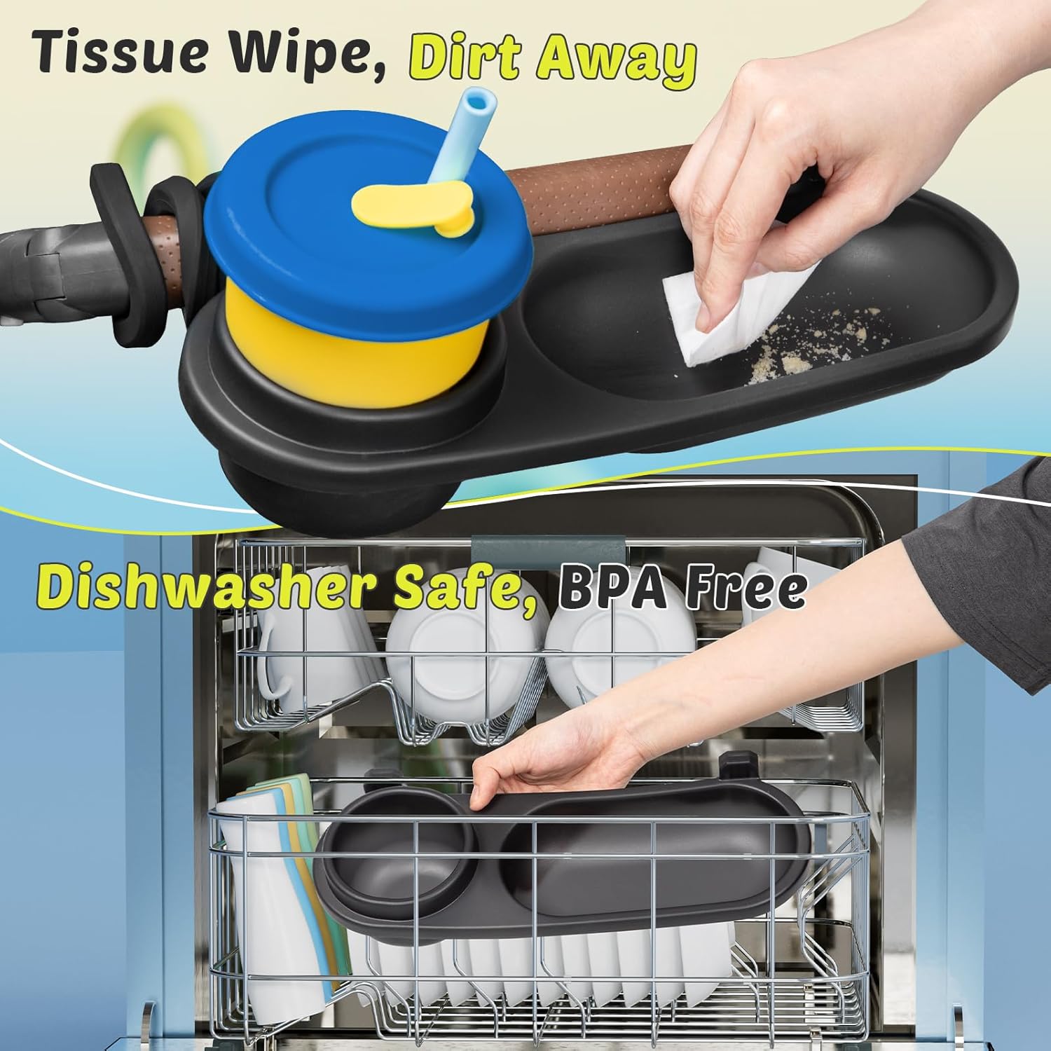 - Easy Install & Remove: The grip quickly wrap around your stroller for a secure fit. For cleaning, simply remove the snack tray—no need to detach the silicone grips. Dishwasher-safe and BPA-free.