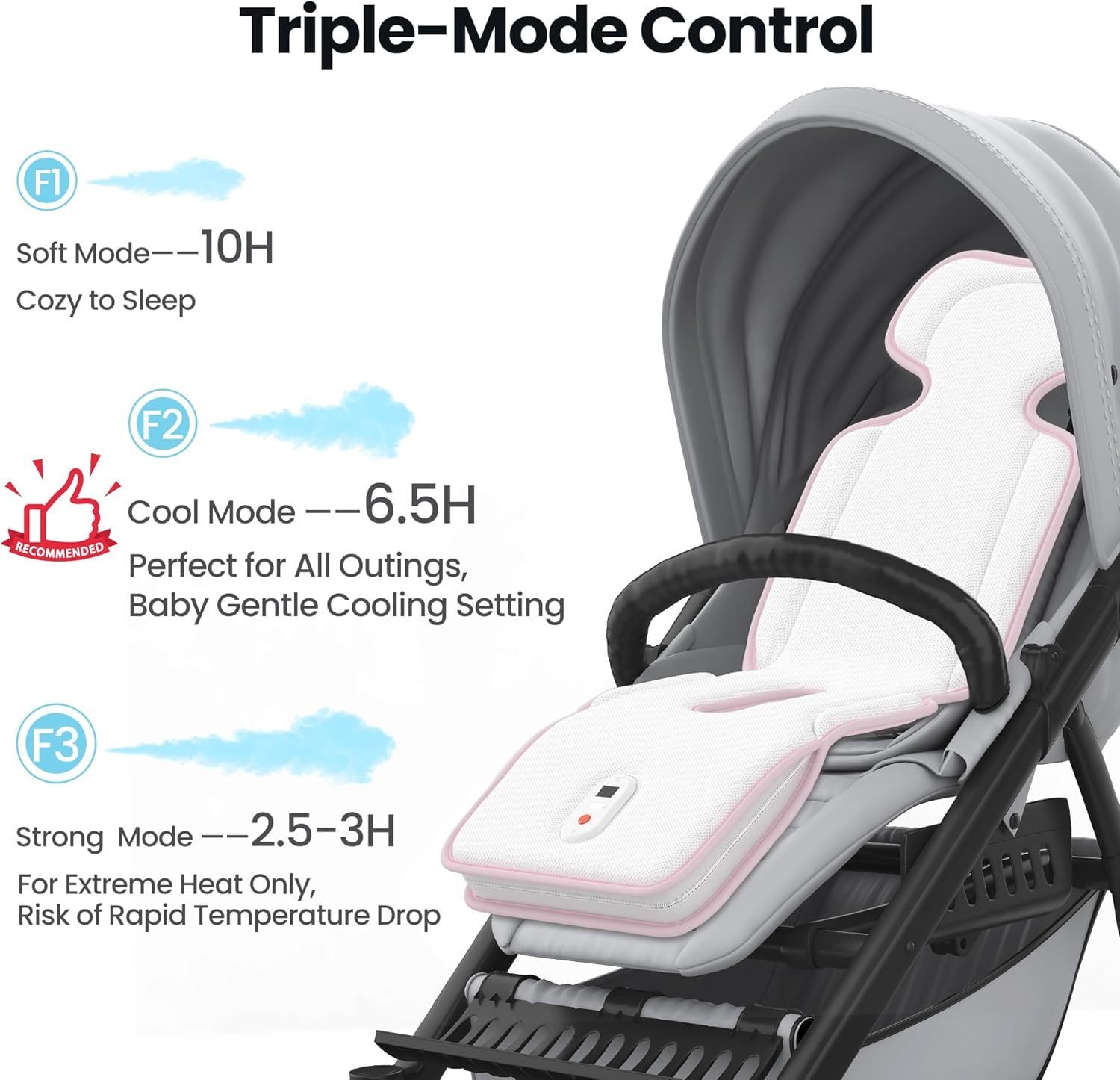 - [Versatile for Multiple Baby Gear]Not limit comfort to strollers—our cooling pad seamlessly fits car seats, high chairs, bassinets, rockers, and swings. Patented 3D airflow + dual Blower Fans work anywhere, delivering targeted cooling to sweat zones. One investment protects your baby’s comfort in every gear, all summer.