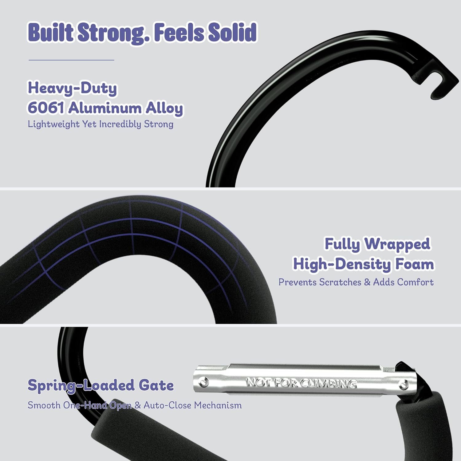 - Full Foam Handle Protects Bags: Featuring a soft foam handle, the stroller hook cushions diaper bags, purses, and backpacks, preventing scratches or damage from metal contact. A perfect stroller accessory to keep belongings safe during outings